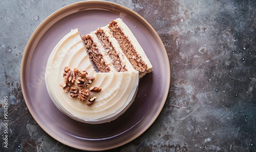 Fig and walnut cake with cream cheese frosting on a muted purple plate