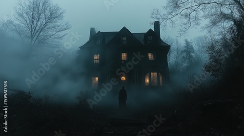 Figure approaching a haunted house in dense fog.