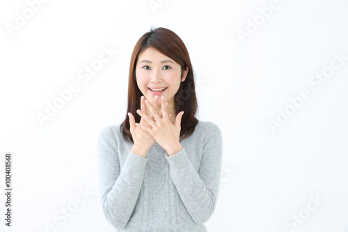 woman, girl, joyful, surprised, surprise, surprised, surprise, happy, proposal, confession, rejoice, lifestyle, live, young, woman, white, white background, smile, smile, sweet, pretty, pretty, clean, people, alone, waist up, adult, homemaker, sweater, winter, fall, fashion, light, refreshing, japanese, asian, beauty, studio, smile, smiling