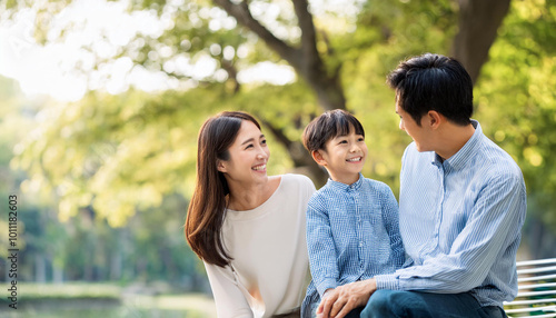 公園で笑顔で会話する家族