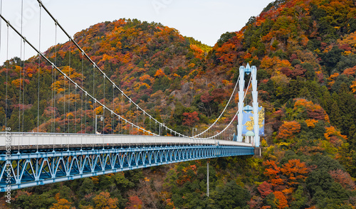 bridge, fall, suspension bridge, landscape, tourist attraction, nature, japan, tour tourism, showplace, mountain, view, journey, landscape, copy space, lovely, clean, canyon, sunny, refreshing, outdoors, construction, overcast, yellow, red, travel, blue skies, sky, architecture, route, port