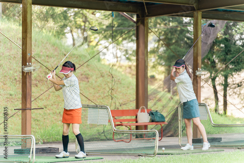 golf, driving range, swing, woman, golfer, golf course, exercise, pursuit, golf club, exercise, golf course, ball game, lesson, green, training, leisure, sport, club, shot, school, golf ball, japanese, beat, open air, summer, vacation, asian, athlete, chinese, korean, people, 30s, grass, two people, girl, woman
