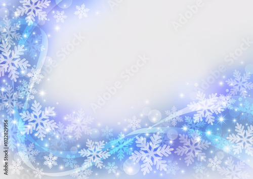 リボンと雪の結晶の背景、青系、クリスマスや新年のイベント等へ