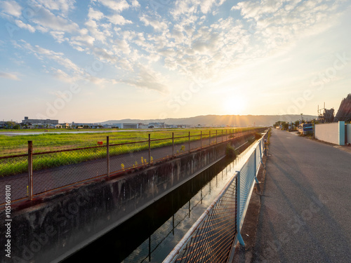 aerodrome, airfield, morning sun, sun, blue skies, sunny, unmanned, japan, mountain, morning, morning, landscape, sky, open air, cloud