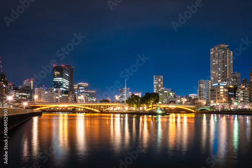night, city, city landscape, water, stream, building, light, bridge, osaka, aged