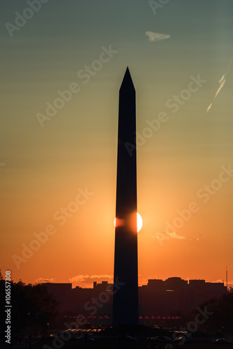 ワシントンモニュメントの夕日 / 夕日がワシントンモニュメントの裏に隠れて少し顔をだしたところです。