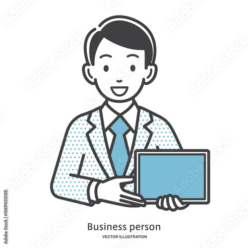 business, businessman, tablet, vector, suit, employee, people, work, man, illustration, ok, salaried employee, 30s, work, pose, expression, waist up, smile, screen, monitor, operator, office, cyberspace, corporation, version, refer, customer service, presentation, man, cartoon