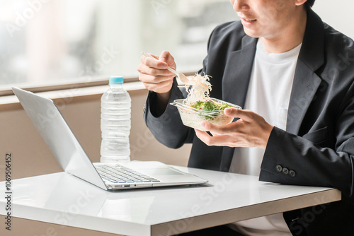 イートインスペース・社員食堂でパソコンを見ながら昼食にお弁当を食べる若いアジア人男性ビジネスマン