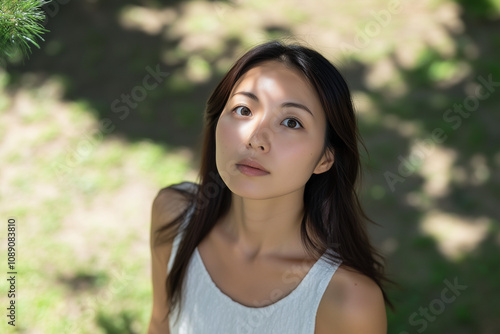 japanese, woman, grove, blue skies, skincare, nature, dress, cleanliness, light, hope, expression, smile, landscape, green, relax, refreshing, vacation, woman, beauty, smile, smiling, hair, face, outdoors, people, summer, person, model, park, happiness, fashion, lifestyle, eye, outside, grass, cosmetic, camisole, singlet, natural