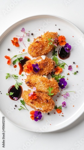 料理の芸術: 食用花を添えた、明るくカラフルなパン粉をまぶしたコロッケの盛り合わせ
