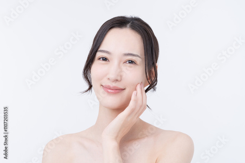skincare, arm, woman, skin, cosmetic, beauty, beauty, japanese, people, pointer, bare skin, health, health care, white background, waist up, face, copy space, 30s, lifestyle, smile, smile, natural, woman, beauty, model, person, glamour, clean, felt, smiling