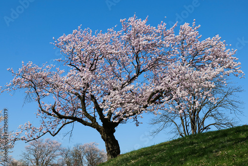 sakura, copy space, sakura, pink, hill, park, slope, big, japan, spring, wood, cherry blossom, full bloom, sky, nature, look up, tour tourism, tourist attraction, blue, blue skies, landscape