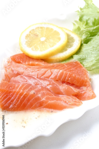 carpaccio, salmon, seafood, hors d'oeuvre, vegetable, italian cuisine, dish, salad, food, seafood, lemon, starter