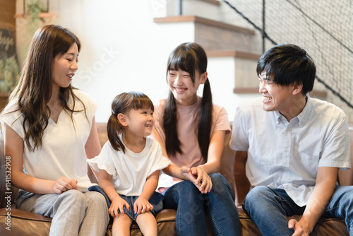 couch, relax, family, adult, man, people, seated, smile, indoor, japanese, woman, 30s, portrait, children, girl, sister, toddler, young, room, asian, couple, father, mother, home, mother, father