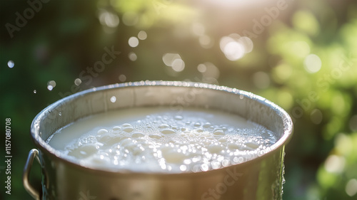 朝の日本牧場、丁寧に汲まれた酪農用バケツのミルク