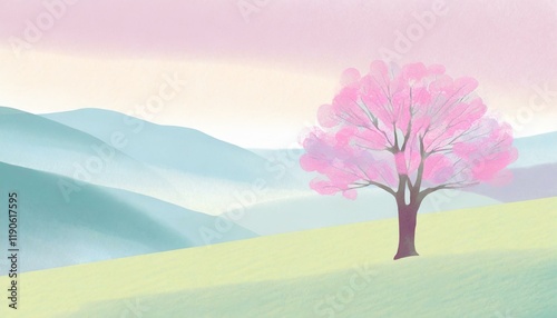 spring, sakura, cherry blossom, pink, pink, wood, cherry tree, hanami, meadow, grass, green, great, nature, landscape, view, landscape, hill, mountain, landscape, sky, cloud, blue skies, pastel colour, light, glitter, shiny, wallpaper, illustration, background, frame, picture, copy space, pretty, graduation, celebration, healing, contemplation, healing, relax, mind