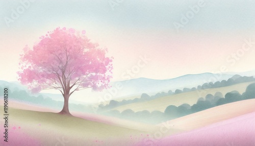 spring, sakura, cherry blossom, pink, pink, wood, cherry tree, hanami, meadow, grass, green, great, nature, landscape, view, landscape, hill, mountain, landscape, sky, cloud, blue skies, pastel colour, light, glitter, shiny, wallpaper, illustration, background, frame, picture, copy space, pretty, graduation, celebration, healing, contemplation, healing, relax, mind