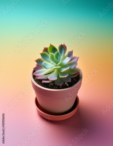 春の暖かな日差しを感じるパステルカラーのグラデーション背景に、ポットに植えられた小さな多肉植物が優雅に存在