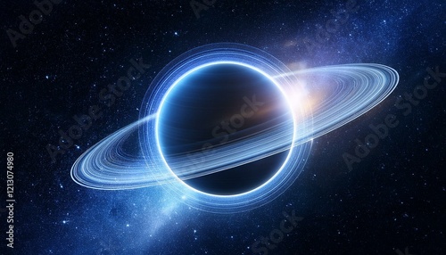 깊은 우주 속에서 빛나는 고리 형태의 행성, 행성 주위에 떠다니는 작은 별들이 강조된 장면