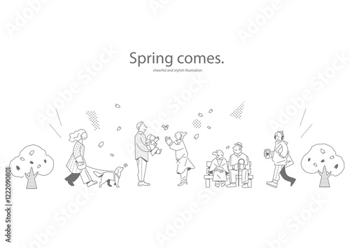 people, plural, variation, set, woman, man, family, missy, aged, aged, student, lad, pet, dog, lifestyle, cherry blossom, flower petals, live, smile, happiness, happy, life, spring, handwriting, open air, park, walk, outing, walk, japanese, black-and-white, monochrome, illustration