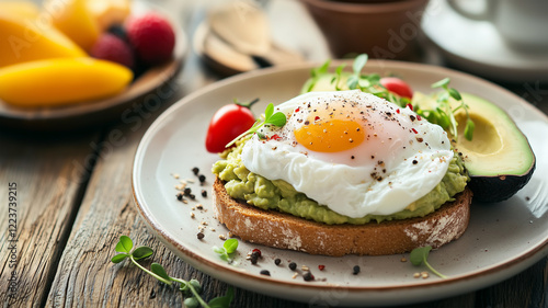 アボカドとポーチドエッグが乗ったトーストのヘルシーブレックファスト
