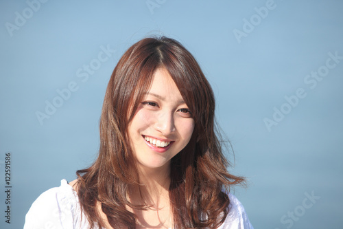 woman, people, girl, young, sweet, relax, smile, smile, cleanliness, open air, sea, sea, sunny, light, wind, whiff, japanese, asian, portrait, healthy, refreshing, calm, summer, season, waist up, landscape, light, beach, water surface, health, beauty, light