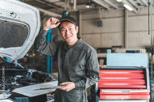 mechanic, mechanic, greeting, check, maintenance, working man, checklist, auto mechanic, improvement, diagnostic, car, auto, smile, inspection, receiving, man, affirmation, workwear, hood, pit, workshop, fitter, business, work, factory, car, japanese, asian, people