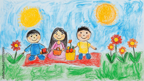 幼児の自由な創造|色鮮やかな家族と花のイラスト