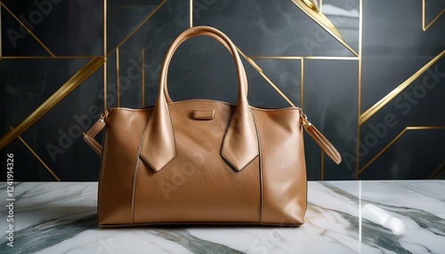 고급스러운 가죽 토트백이 대리석 테이블 위에 놓여 있다