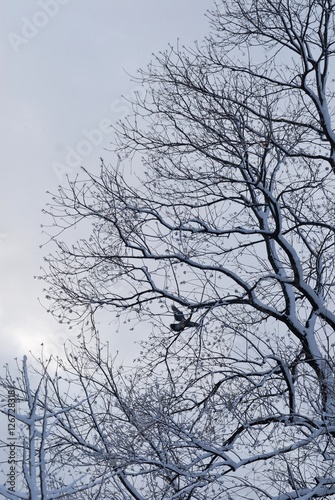 snow, pigeon, open air, wood, cold, nature, park, white, season, black, winter, weather, sky, frost, scene, lovely, background, wind, bird, wing, fly, expand