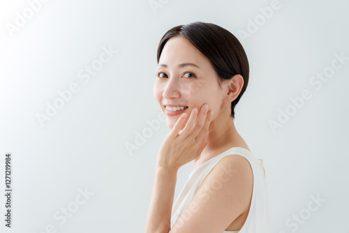 30s, woman, dryness, skin, cosmetic, toilet water, japanese, lifestyle, short hair, homemaker, profile, up, copy space, casual, enzyme, beauty, smile, skincare, white background, portrait, sunblock, asian, natural, pretty, smile, middle-aged, refreshing, cosmetic, people, indoor, indoor