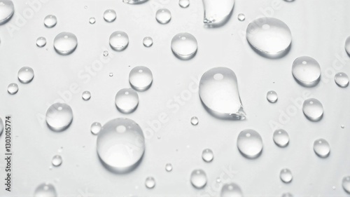 白い背景に輝く光を乱反射した透明な水滴が浮かぶ、清潔で爽やかなテクスチャー