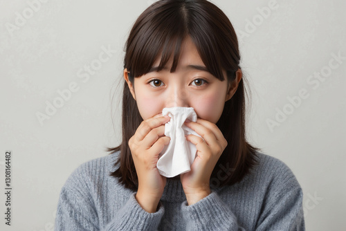 rhinitis, hay fever, malfunction, children, girl, woman, spicey, allergy, pollen, cephalalgia, copy space, medical care, asian, waist up, young, japanese, flu, cold, snot, sneeze, prevention, people, health
