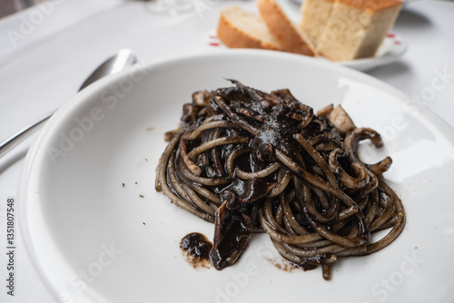 sepia, pasta, spaghetti, sauce, black, food, meal, meal, dish, cooking, epicurean, delicious, eatery, foodstuff, italian cuisine, lunch, dinner, pasta, noodle, dish, bread, toast, bread