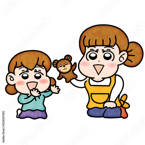 kindergarten, preschool, nurse, children, puppet, game, children, girl, illustration, vector, bear, kind, sweet, people, material, white background, illustration, japanese, illustration, smile, two people