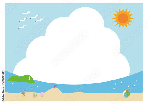 frame, background, summer, summer getaway, sea, beach, beach, thunderhead, sky, sun, hot, seashell, beach ball, island, vacation, horizontal, gull, season, illustration, vector, sweet, casual, children, affinity, pastel colour