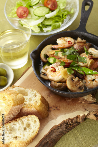 tapas, knob, dish, baguette, bread, olive oil, garlic, shrimp, mushroom, asparagus, olive, salad, frying pan