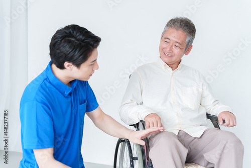 care, wheelchair, nurse, physical therapist, rehabilitation, aged, man, aged, knee, injury, foot, speaking, conversation, helper, assistance, assistance, user, smile, aged, japanese, asian, 60's, two people, facility, nursing home, day care, wheelchair, care worker, nurse, medical care, staff, staff, welfare, work, work, support, nurse, white background, fracture, people