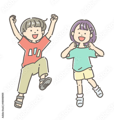 children, people, boy, girl, children, children, jump, japanese, smile, chum, fun, sweet, lively, fly, jumping, illustration, vector, set, happy, summer, summer getaway, brother, brother, sister, friends, group, fellow, training, elementary school, play, children, analog, pair, boy, woman, two people, cartoon