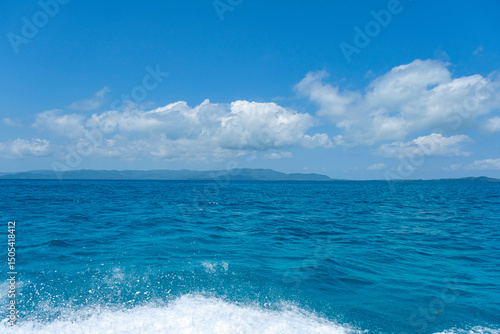 sea, island, landscape, boat, fast, sunny, coral reef, emerald green, blue, sky, cloud, nature, wave, horizon, okinawa, wind, summer, resort, transportation, tour tourism, vehicle, sea, speed, cruise, copy space