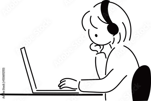 ノートパソコンで音楽を聴きながら仕事するシンプルな線画の女の子イラスト