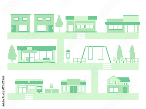 town, town, residential area, park, convenience store, illustration, illustration, white background, house, architecture, street, city, icon, design, property