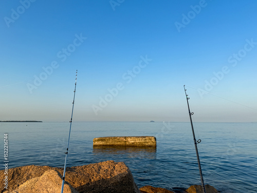 瀬戸内海の青い空と青い海の防波堤で魚釣り