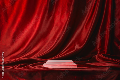 赤いシルクの布で覆われたアクリル製の商品台。ステージ