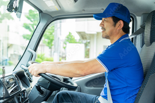 truck, smile, driver, workwear, transport, delivery, courier service, relocation, driver, move, delivery, sideline, logistic, circulation, transport, truck driver, cap, uniform, drive, carry, handle, man, middle-aged, people, japanese, transport