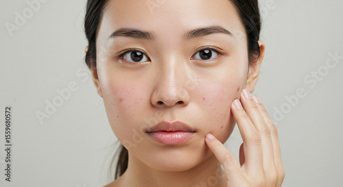 肌トラブルに悩む日本人人女性、素肌ポートレート(ノーメイク・高解像度)、シミやニキビ、毛穴の悩み