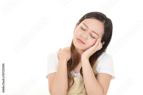 japanese, woman, woman, people, homemaker, housekeeping, mother, people, family, home, mother, flop, fatigue, stress, fatigue, overwork, symptom, marode, medical care, pain, sweet, pretty, young, adult, work, work, apron, housekeeper, model, beauty, smile, happy, health, expression, alone, okinawa, japan, asian, waist up, copy space, white background