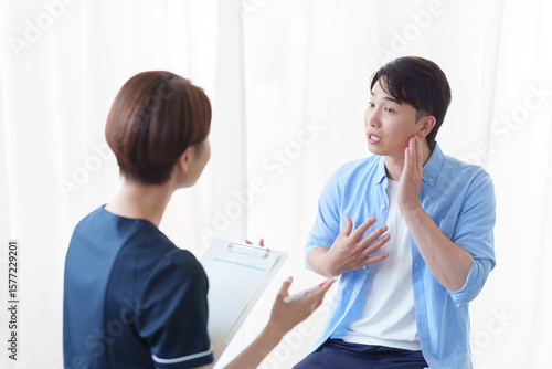 man, epilation, beard, beard, counseling, skin, consultation, trouble, acne, dermatitis, exam, nurse, japanese, woman, patient, medical care, cosmetic, face, two people, 30s, middle-aged, young, asian, marode, version, health care, treatment, diagnosis, hospital, clinic, health, barbed, skin, irritation, delicate, jaw, people, skincare, conversation, speaking