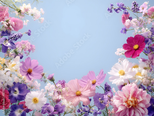 青空を背景に咲き誇る色とりどりの春の花々が美しいフラワーフレーム構図