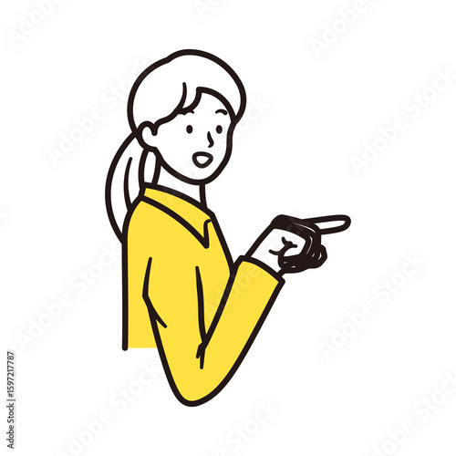 笑顔で指差ししているビジネスウーマンの横向のシンプルな上半身のイラスト素材